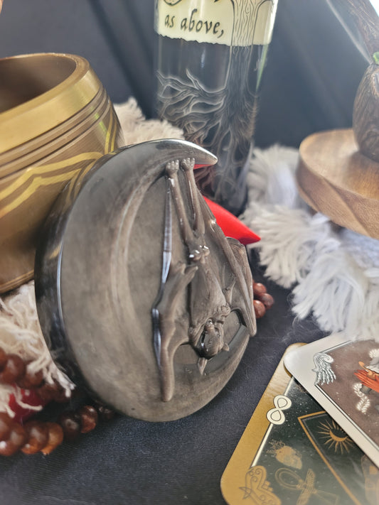 Silver Obsidian Moon Carving: Bat or Dragon Guardian of Shadow Work