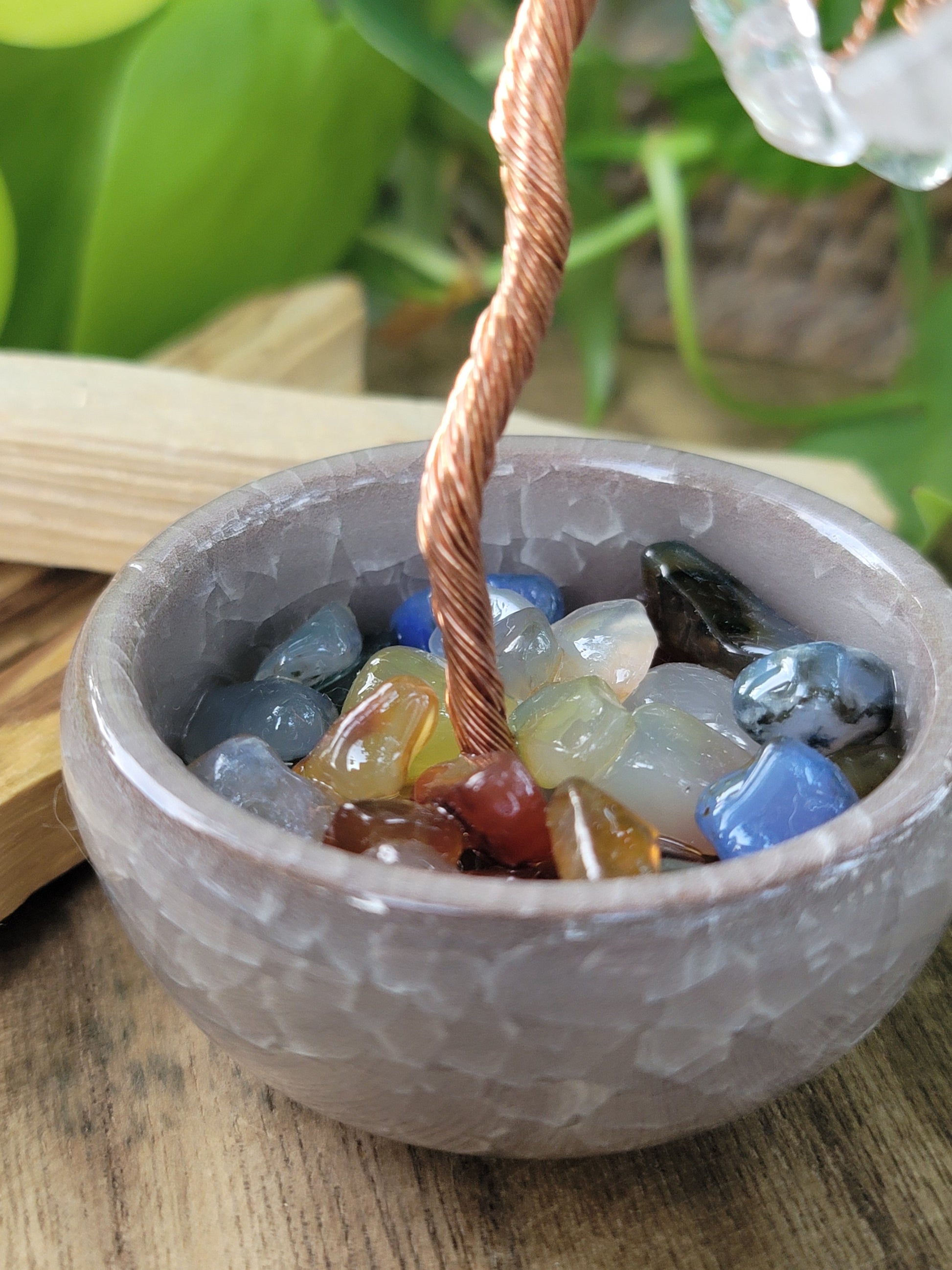 Each piece is handmade and features a crystal chip tree growing from a bowl-style base. Size and crystal types may vary. Bowl is suitable for small tumbles or lightweight objects. Intuitively selected.